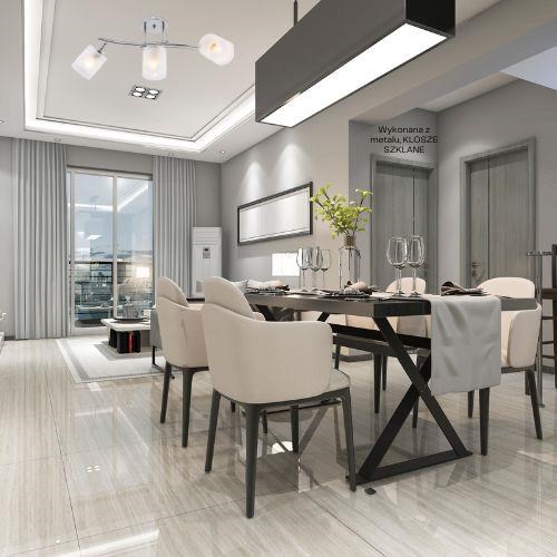 wyglądał w salonie, jadalni, pokoju czy sypialni. Metaliczny kolor lampy