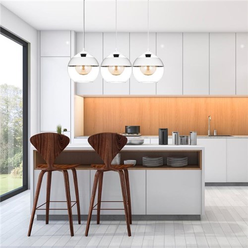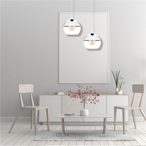 Lampa wisząca Thalin to uniwersalny model. Nowoczesna lampa o transparentnym, szklanym kloszu, który zachwyca lekkością i czystością formy. Jej wyróżnikiem jest dekoracyjny biały pasek – poziomy lub pionowy – który nadaje całości wyrazisty, graficzny charakter i subtelnie kontrastuje z przejrzystością szkła.